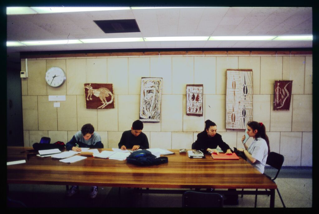 Students Sitting at Large Table in Fisher Library Foyer (1990s), [REF-00096840]. University of Sydney Archives, accessed 02/02/2026, https://archives-search.sydney.edu.au/nodes/view/150005.