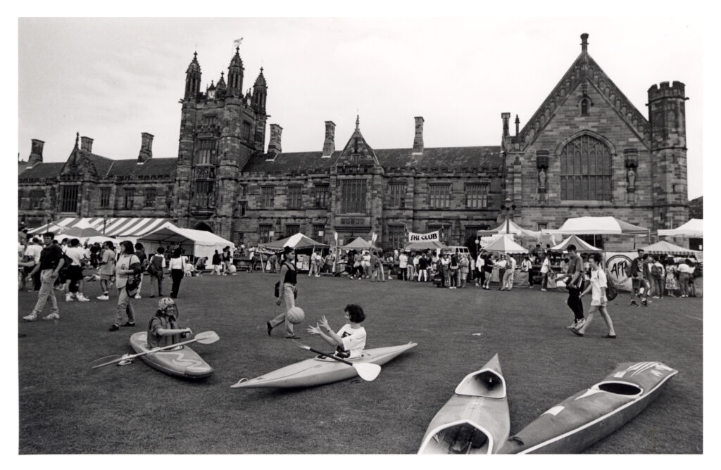Students in Kayaks on Front Lawn at Orientation Week 1992 (1992), [REF-00011048]. University of Sydney Archives, accessed 10/11/2025, https://archives-search.sydney.edu.au/nodes/view/34407.