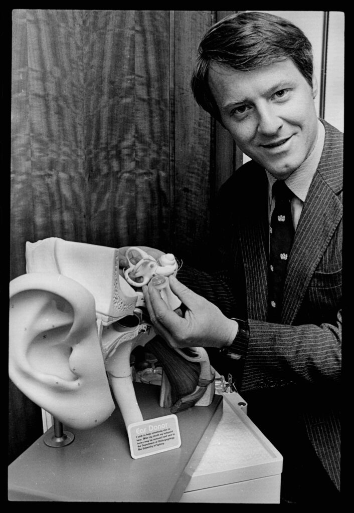 Professor Bill Gibson with Ear Implant Device (1984), [REF-00012440]. University of Sydney Archives, accessed 30/10/2025, https://archives-search.sydney.edu.au/nodes/view/30892.