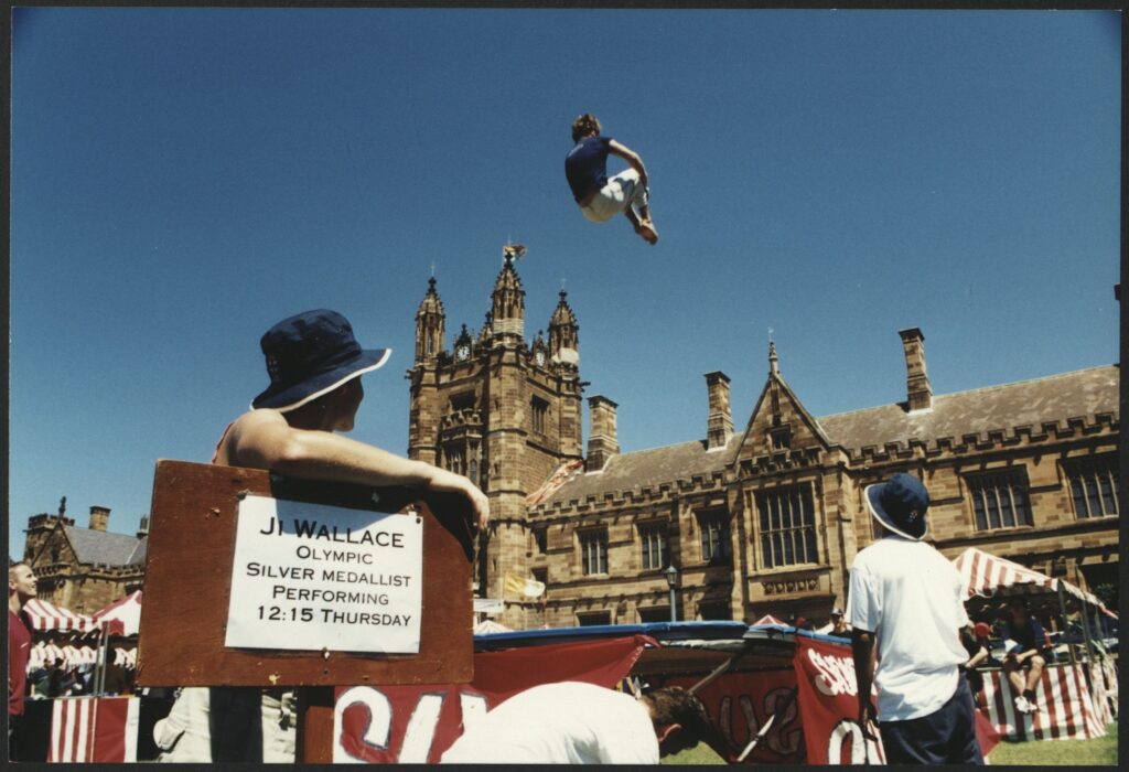 Ji Wallace, Olympic Silver Medallist, Trampolining on Front Lawn During Orientation/O Week (22/02/2001), [REF-00098089]. University of Sydney Archives, accessed 02/12/2025, https://archives-search.sydney.edu.au/nodes/view/151254.